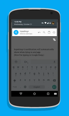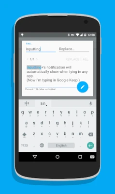 Inputting+'s notification will automatically appear when typing. It can help you undo, redo, find & replace text, just like ctrl+z, ctrl+f, ctrl+c, ctrl+v on computer. And even quick insert clipboard history!