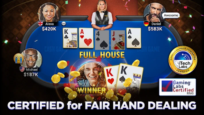 The strong Random Number Generator (RNG) implements every hand dealing of Poker Championship, thereby ensuring absolute fair game. Our game has been certified by Gaming Laboratories International, the global leading company in gaming and lottery testing.
